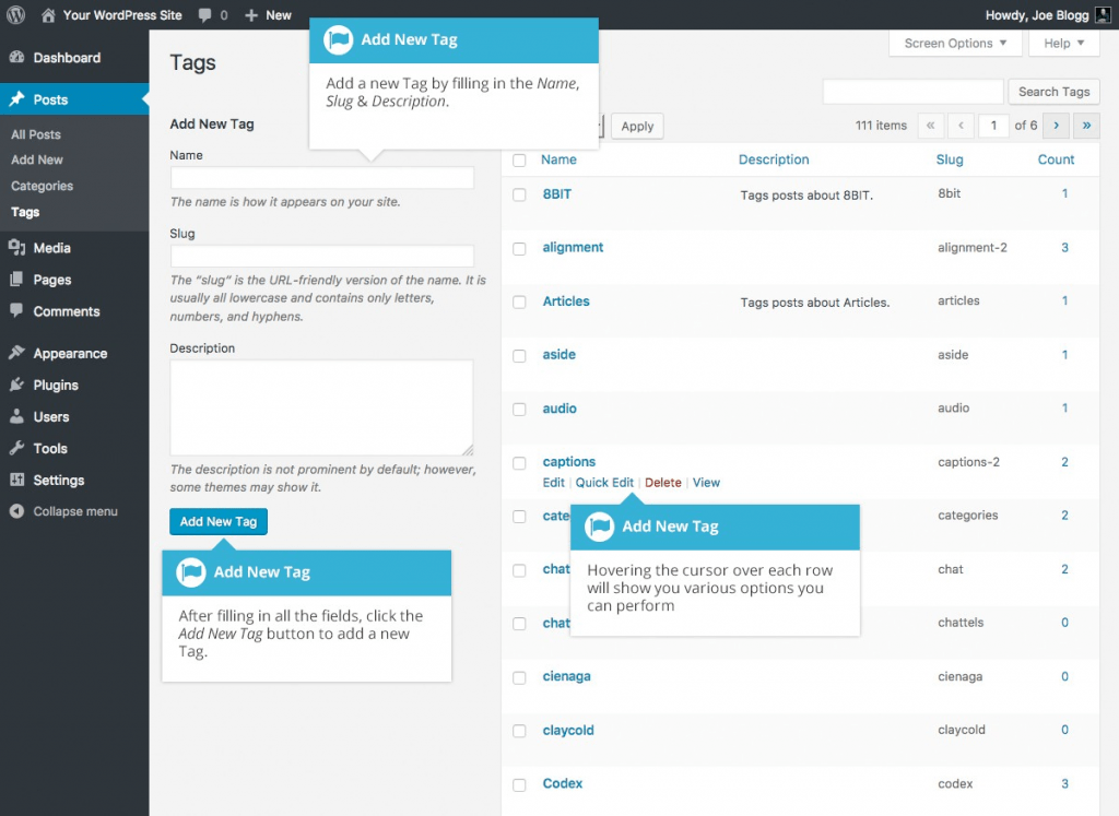 - Quick Edit – Allows you to quickly edit the Tag Name and Slug